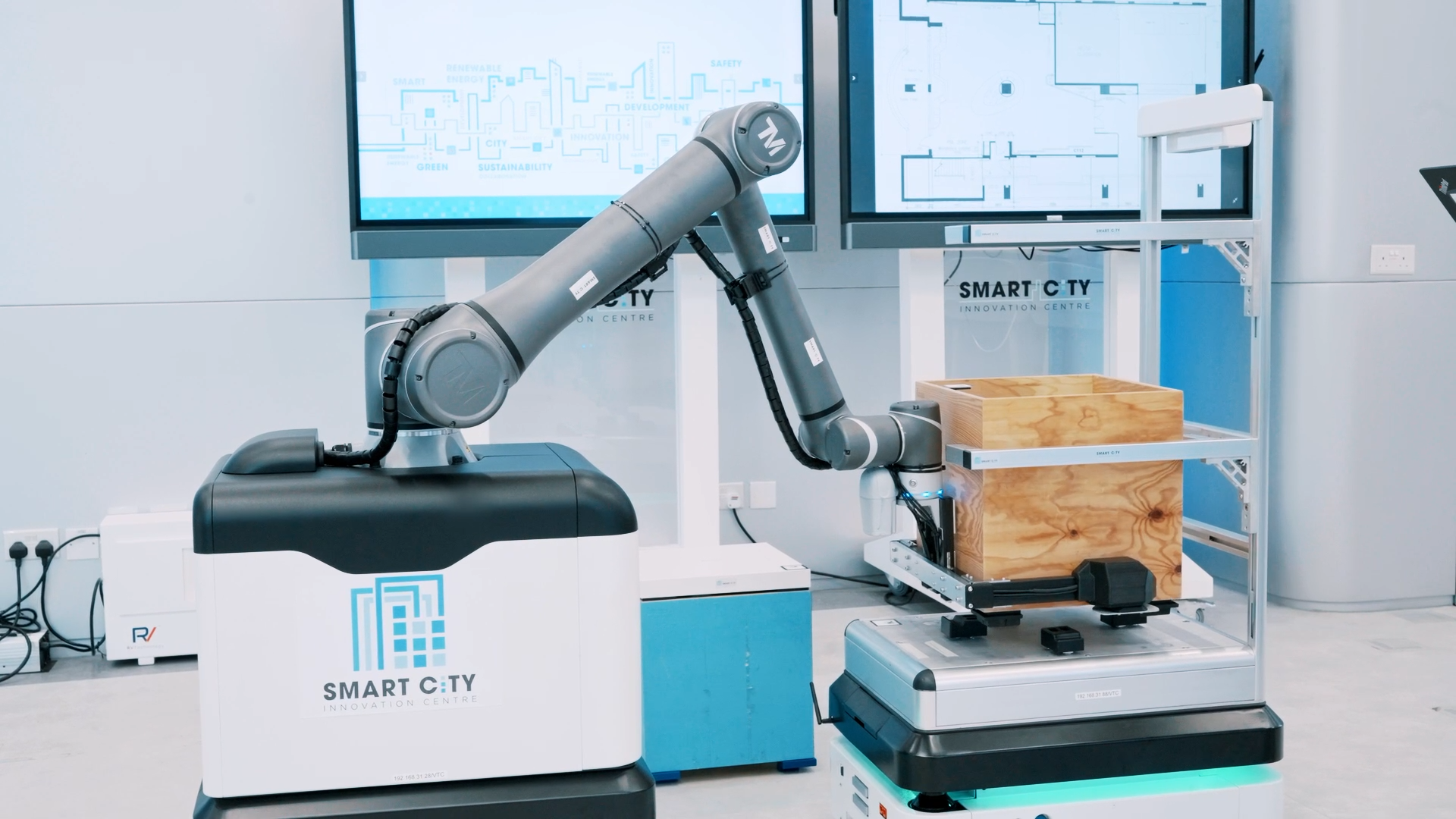 A Smart Transport Robot System consisting of two robots: the Transportation Robot and the Stacking Robot with Robot Arm. These robots collaborate and communicate with each other to efficiently perform automatic chair transportation tasks with predefined patterns.