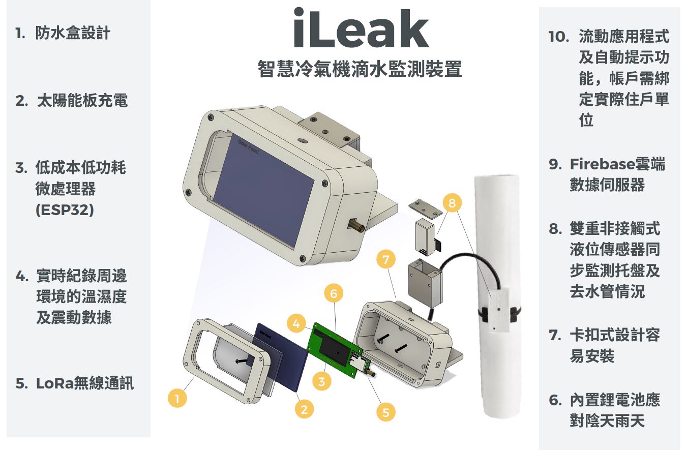 With its real-time data recording, LoRa wireless communication, dual liquid level sensors, Firebase cloud data server, mobile app, and automated alert function, iLeak ensures efficient operation, proactive prevention of water leakage, and timely response to potential issues.